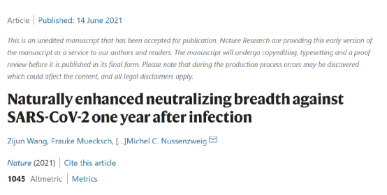 近日,由洛克菲勒大学的研究团队在Nature上发表了一篇预印文章,标题为:“Naturally enhanced neutralizing breadth against SARS-CoV-2 one year after infection”,表明在被新冠病毒感染一年后,仍然维持了对新冠病毒的免疫力,并有增强的趋势!一经发表便引起了广泛的关注,这对于控制疫情的传播是十分可喜的成果!