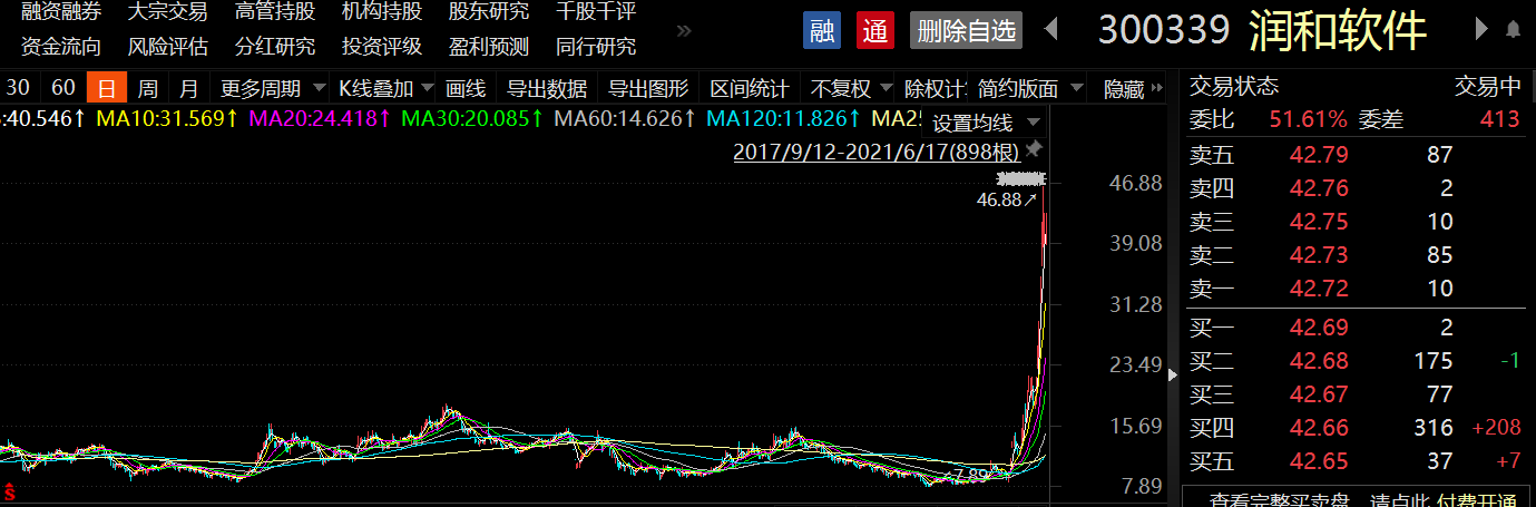 润和软件于2012年7月18日正式登陆A股市场,发行价为20.39元/股。2015年公司股价大涨,最高涨至93.88元/股,此后股价持续调整。2017年6月至2021年5月的近四年时间,润和软件股价均在10元上下徘徊,直至此次大涨。