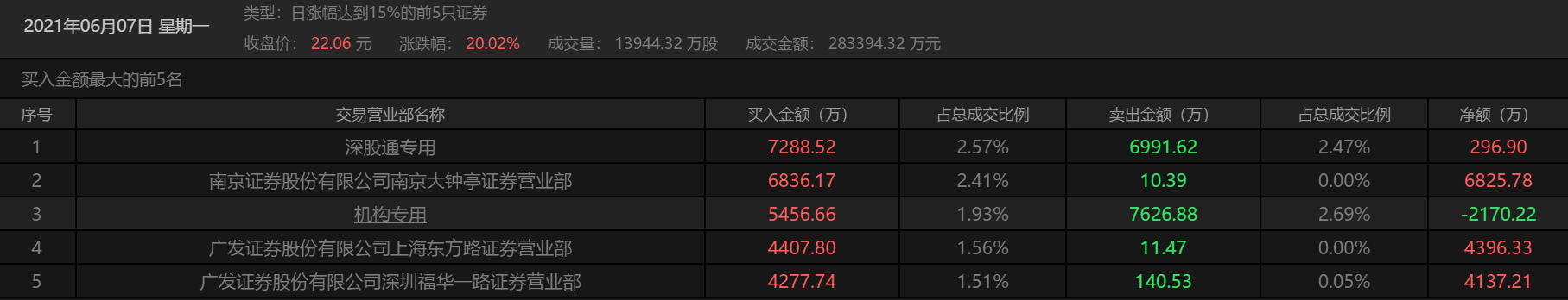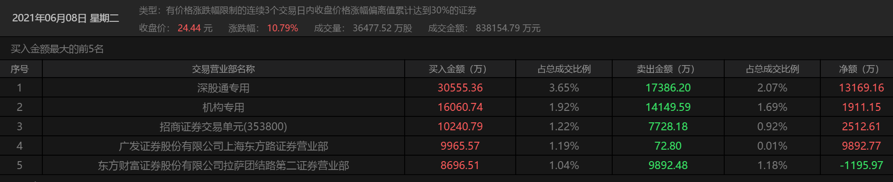 6月7日,深股通专用买入公司股票7288.52万元,卖出6991.62万元,净买入296.90万元;8日,深股通专用买入公司股票3.06亿元,卖出1.74亿元,净买入1.32亿元;而机构专用7日、8日分别买入1.61亿元和5456.66万元。