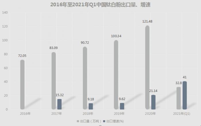海关总署数据显示,2016年至2019年,中国钛白粉出口量分别为72.05万吨、83.09万吨、90.72万吨、100.34万吨,增速保持在10%左右,但是在2020年出口量达到121.48万吨,增速扩大至21.06%。