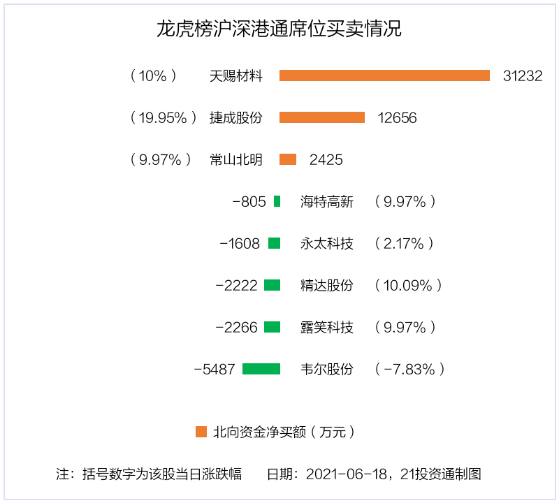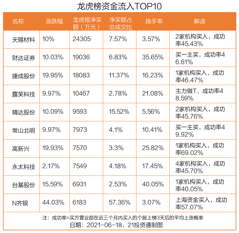 6月18日,上证指数下跌0.01%,深证成指上涨0.77%,创业板指上涨1.59%。盘后龙虎榜数据显示,共有45只个股因当日异动登上龙虎榜,资金净流入最多的是天赐材料(002709.SZ),达2.43亿元。