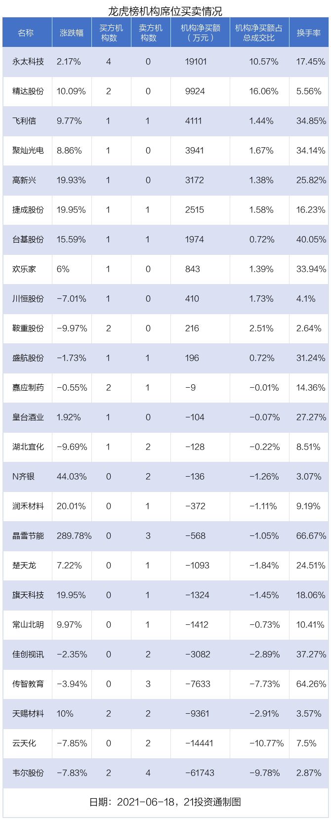 其中,机构净买入金额最多的是永太科技(002326.SZ),当日收盘上涨2.17%,换手率为17.45%。