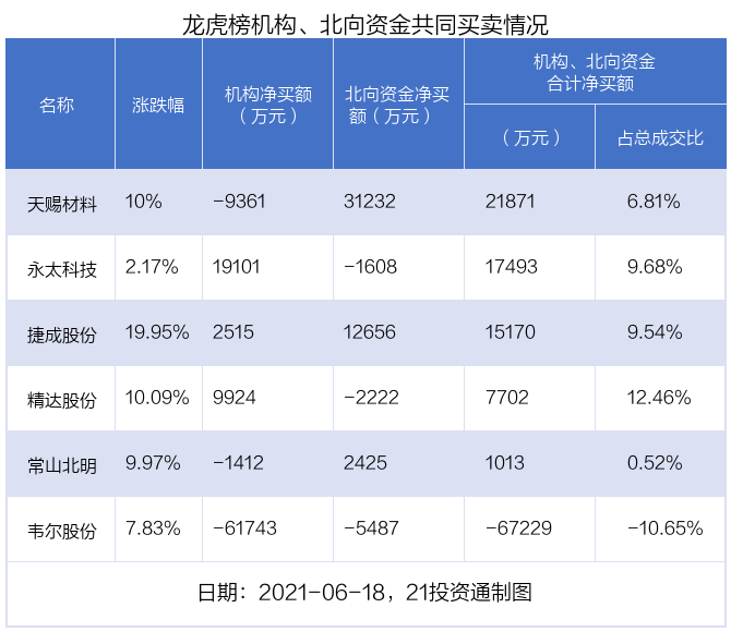 值得注意的是,机构和北向资金共同净买入了捷成股份等1股;共同净卖出了韦尔股份;在天赐材料,常山北明,永太科技,精达股份上出现分歧,机构净卖出天赐材料9360.61万元,北向资金净买入3.12亿元;机构净卖出常山北明1411.98万元,北向资金净买入2425.44万元;机构净买入永太科技1.91亿元,北向资金净卖出1608.17万元;机构净买入精达股份9923.54万元,北向资金净卖出2221.89万元。