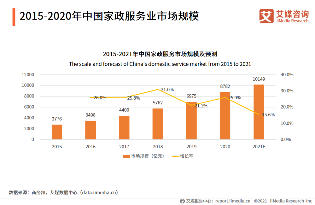 中国家政服务业市场规模增长较快。数据显示,2015年至2020年中国家政服务业市场规模逐年稳步增长,2015年中国家政行业市场规模仅为2776亿元,2020年达到8782亿元,同比增长约26.0%。预计2021年中国家政行业市场规模将达10149亿元。