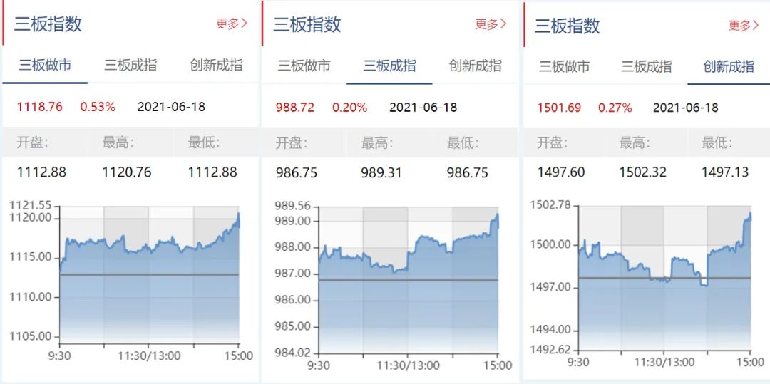 截至6月18日收盘,三板做市报1118.76点,上涨0.53%;三板成指报988.72点,上涨0.20%;三板创新报1501.69点,上涨0.27%。