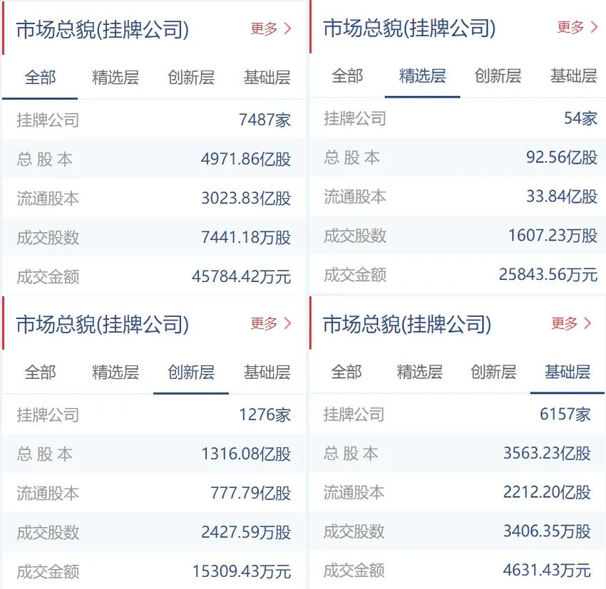 截至6月18日收盘,今日成交金额为4.57亿元,精选层成交金额为2.58亿元,创新层成交金额为1.53亿元,基础层成交金额为0.46亿元;今日成交股数为7441.18万股,精选层成交股数为1607.23万股,创新层成交股数为2427.59万股,基础层成交股数为3406.35万股。