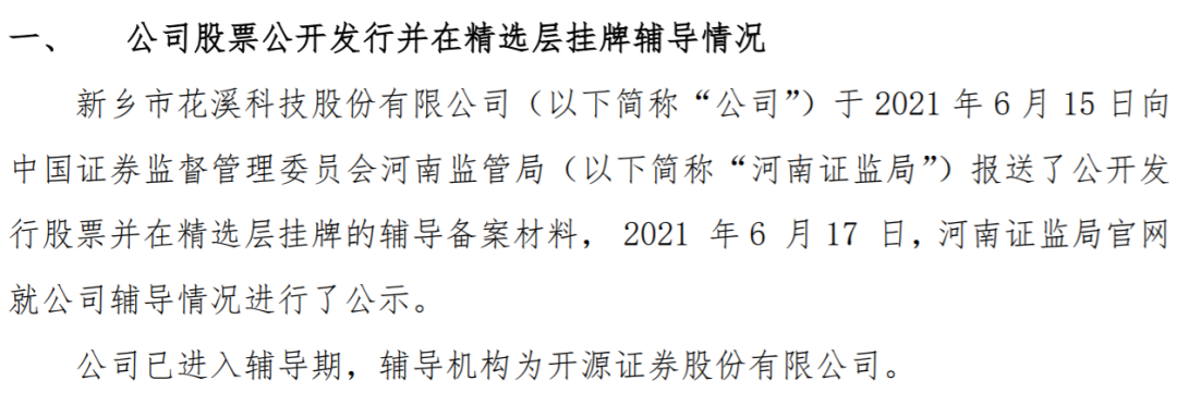 公告显示,花溪科技于2021年6月15日向河南证监局报送了公开发行股票并在精选层挂牌的辅导备案材料, 2021年6月17日,河南证监局官网就公司辅导情况进行了公示,公司已进入辅导期,辅导机构为开源证券。