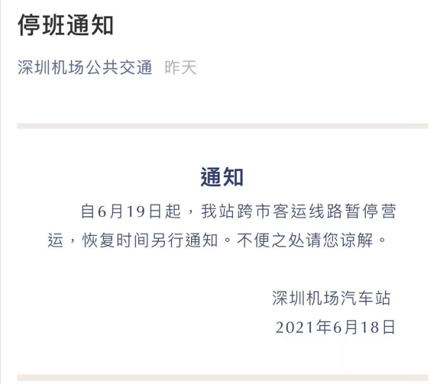 据深圳机场汽车站最新消息,自6月19日起,深圳机场汽车站跨市客运线路暂停营运,恢复时间另行通知。