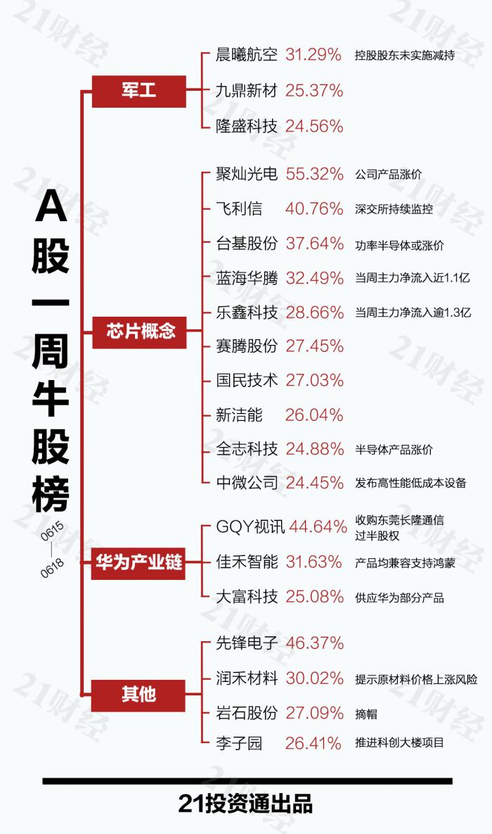 此外,军工板块发力上扬,牛股榜上相关个股当周涨幅均超24%。随着神舟十二号载人飞船发射圆满成功,国防军工板块重获市场关注,安信策略、中信证券、天风证券等多家机构看好板块未来行情。