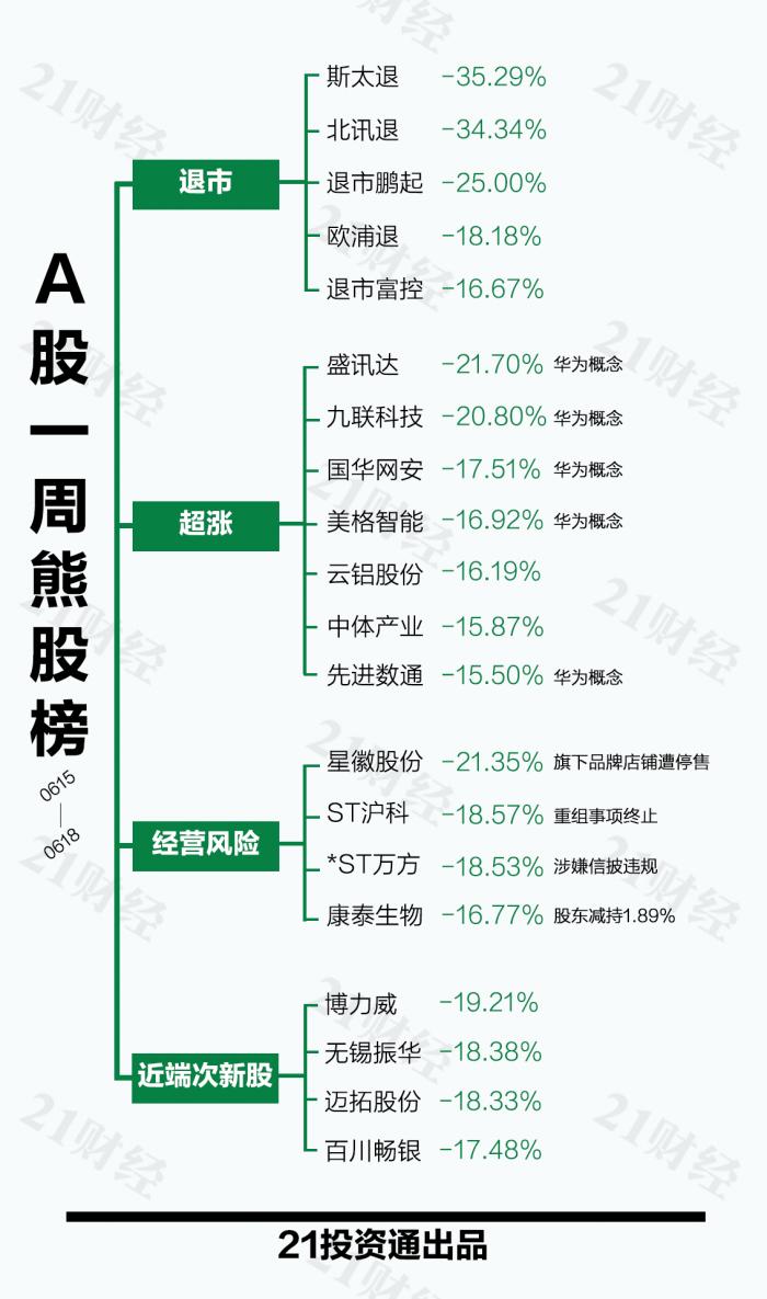 本期熊股榜再有5家退市公司:斯太退(000760.SZ)、北讯退(002359.SZ)、退市鹏起(600614.SH)、欧浦退(002711.SZ)、退市富控(600634.SH),其中斯太退、北讯退近6个交易日已连续一字跌停。