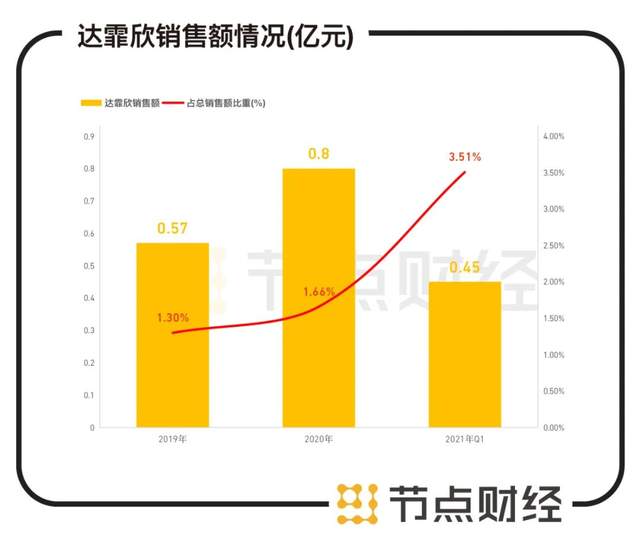 以振东制药为例,其子公司安特制药生产米诺地尔搽剂(达霏欣),达霏欣的销售额在2021年一季度同比增长达220.21%,为4536.05万元。根据相关公告,2019年,达霏欣的销售额为5702.66万元,占振东制药总销售额的比重仅为1.30%;2020年,销售额上升至8039.16万元,占比达1.66%;而在2021年一季度,销售额占比已达3.51%。