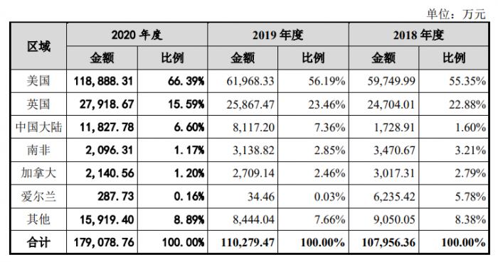 报告期内,公司外销收入分别为10.62亿元、10.22亿元和16.73亿元,占营收比例分别为98.40%、92.64%和93.40%,其中对欧美市场收入分别为10亿元、9.6亿元和15.5亿元,分别占其主业收入的92.59%、86.80%和86.37%。