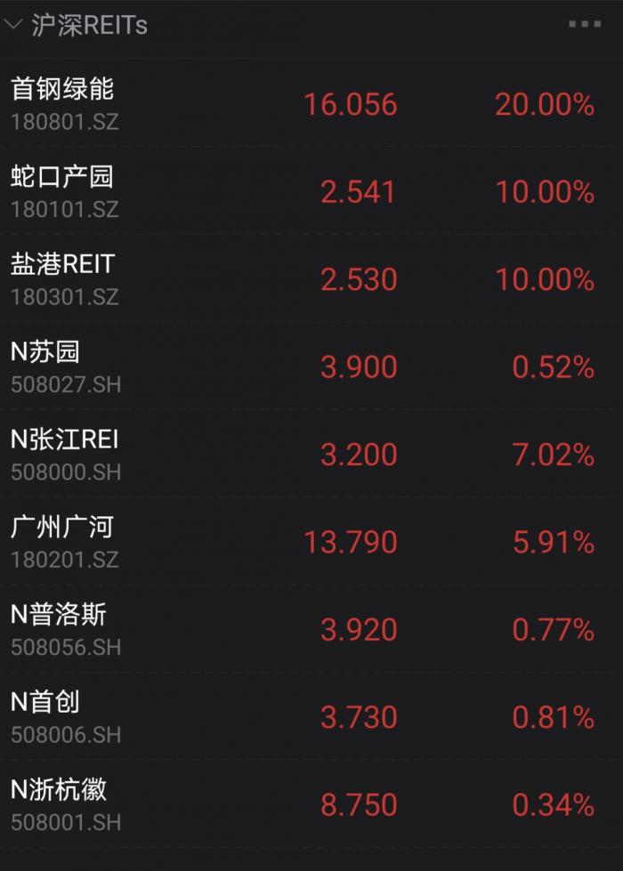 首批REITs正式上市的一刻,终于来了!6月21日,上交所、深交所首批9只公开募集基础设施证券投资基金正式上市。开盘全线翻红,首钢绿能以20%涨幅领涨。蛇口产园、盐港REIT涨10%。