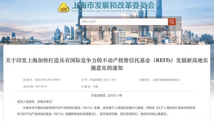 6月21日,上海市发展和改革委员会(简称“上海发改委”) 与市地方金融监管局、上海证监局、市财政局、市国资委、市税务局、市人力资源社会保障局、市规划资源局等单位联合印发《关于印发上海加快打造具有国际竞争力的不动产投资信托基金(RRITs)发展新高地实施意见的通知》(简称“上海REITs20条”),意见自2021年8月1日起施行,有效期至2026年7月31日。
