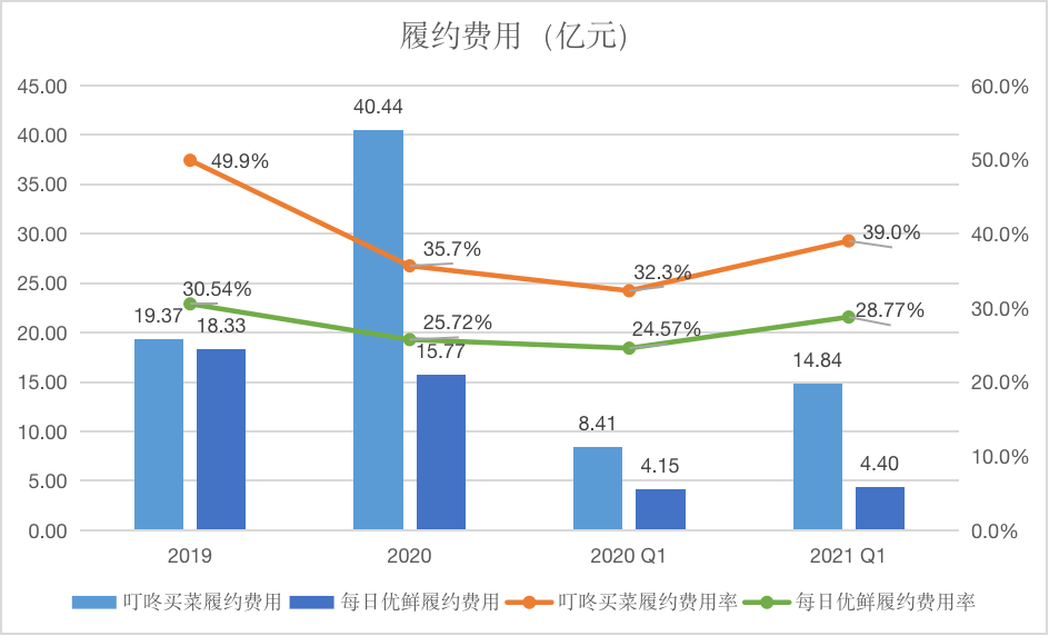 2019年和2020年,叮咚买菜的履约费用率是49.9%和35.7%,同期每日优鲜的履约费用率为30.54%和20.72%。
