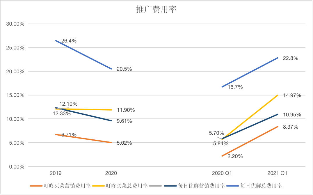 此外,在研发和推广方面,靠“砸钱”来创造规模也是前期避免不了的。招股书显示,2019年和2020年,每日优鲜的营销费用分别为7.40亿和5.89亿元,叮咚买菜同期该数据为2.60亿和5.69亿元,算上研发费用和管理费用,每日优鲜这两年的总费用率为26.45%、20.51%,同期叮咚买菜的总费用率为12.1%和12.9%。即使每日优鲜将加工费、包材费等费用算入成本而非费用,其总费用率也和叮咚买菜保持同水平,尚无优势。