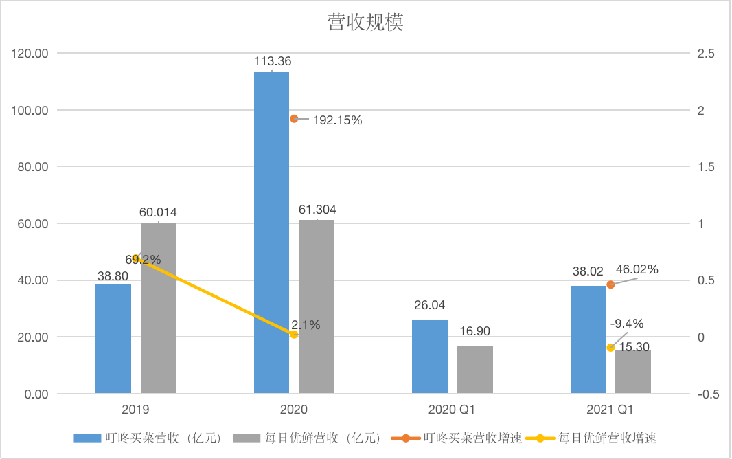 不管是财务和经营数据,叮咚买菜都实现了反超。同时,每日优鲜自身的增长也不太乐观,2020年,叮咚买菜的营收同比增速为192.15%,而每日优鲜的增速为2.15%,2021年Q1,每日优鲜的增速已经跌至-9.44%。