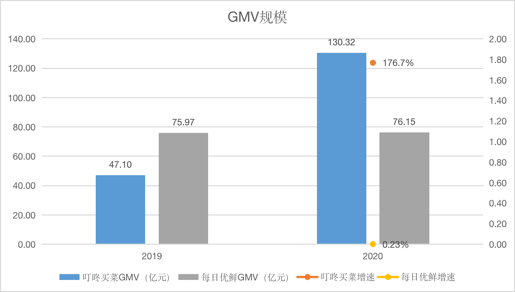 2020年,叮咚买菜的GMV与营收分别为130.3亿元和113.4亿元,年复合增长率为319.2%;每日优鲜的数据则为76.1亿元与61.3亿元,年复合增长率为47.67%。2021年一季度,叮咚买菜实现营业收入38.02亿元,亦是每日优鲜的2.5倍左右。
