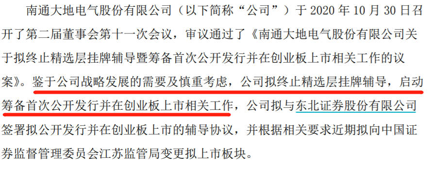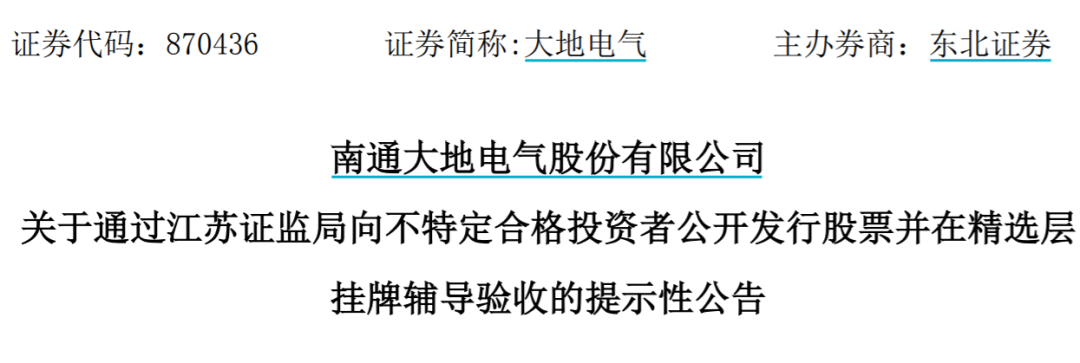 公告显示,大地电气于2021年5月19日向江苏证监局报送了《东北证券股份有限公司关于变更南通大地电气股份有限公司拟上市板块的申请》和 《南通大地电气股份有限公司关于变更南通大地电气股份有限公司拟上市板块的申请》,将创业板上市辅导变更为精选层挂牌辅导。