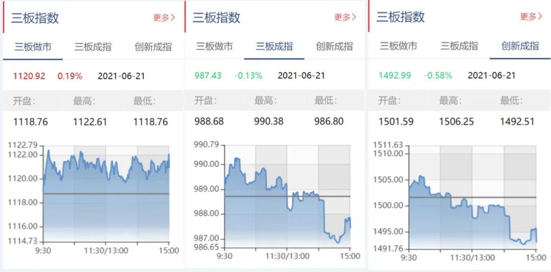 截至6月21日收盘,三板做市报1112.92点,上涨0.19%;三板成指报987.43点,下跌0.13%;三板创新报1492.99点,下跌0.56%。