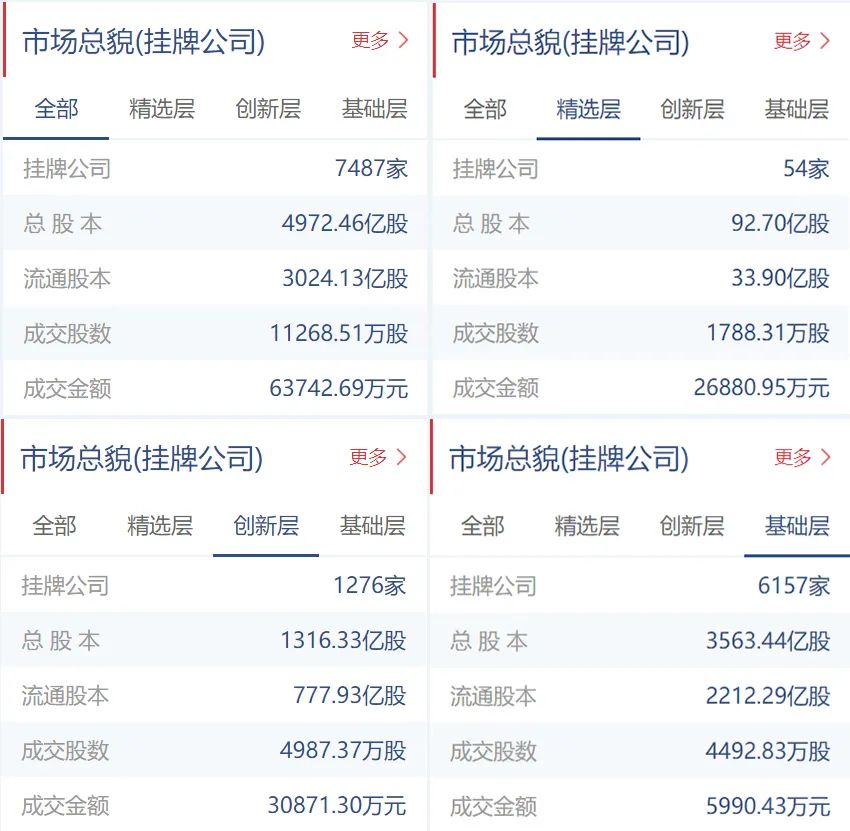 新三板挂牌公司总计7487家(精选层54家,创新层1276家,基础层6157家),总股本4972.46亿股,流通股本3024.13亿股。