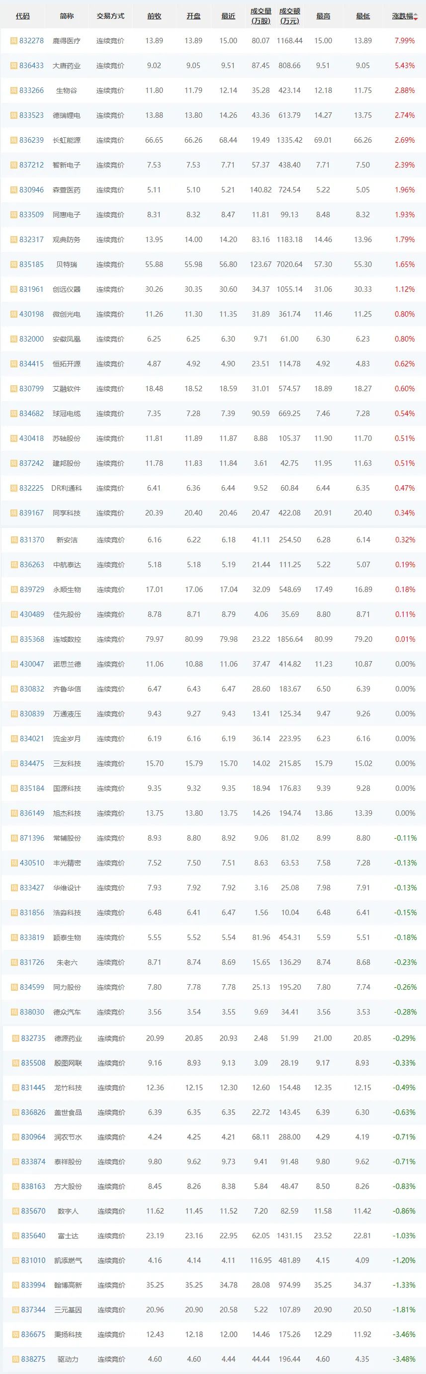 6月21日,精选层涨跌互现,25家企业上涨,7家平盘,22家下跌。其中,鹿德医疗(832278)上市首日涨幅居首,上涨7.99%;其次,大唐药业(836433)上涨5.43%;驱动力(838275)跌幅居首,下跌3.48%;秉杨科技(836675)居次下跌3.46%;诺思兰德(430047)、齐鲁华信(830832)等平盘。
