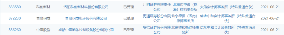 6月21日,科创新材(833580)、青岛积成(833580)、中寰股份(836260)精选层申报材料获全国股转公司受理,保荐机构分别为川财证券、海通证券、安心证券。