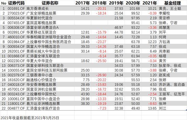 而从易方达亚洲精选来看,下表是按照 2020 年收益排序,前 22 名的 QDII 基金。可以看到张坤的易方达亚洲精选只排名第 21 位。再看截至 2021 年 5 月 25 日的今年迄今收益,张坤的易方达亚洲精选在这批基金中是表现最糟糕的。