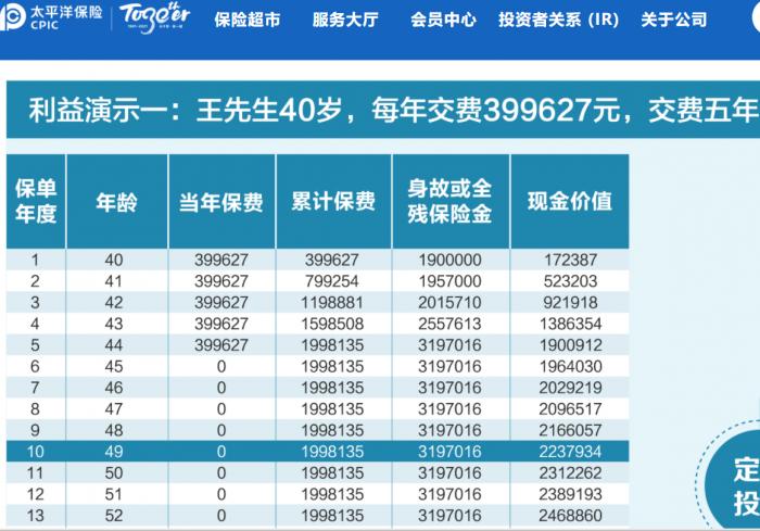 以交费五年的利益演示为例,如果40岁的王先生在“长相伴 A 款终身寿险”生效后的第一年选择退保,将损失399627-172387=227240元;如果王先生第五年选择退保,将获得1900912-399627=1501285元。