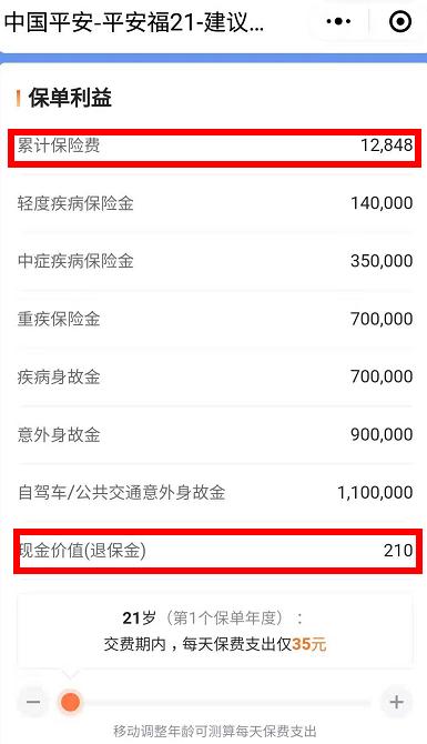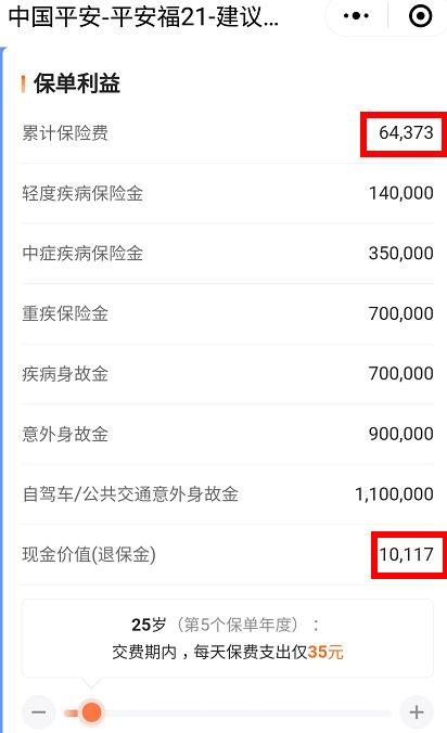 以这款产品的利益演示为例,如果第一年(21岁)选择退保,所交12848元的保费只能退还210元的现金价值;如果第五年(25岁)选择退保,所交64373元的保费可以退还10117元的现金价值。