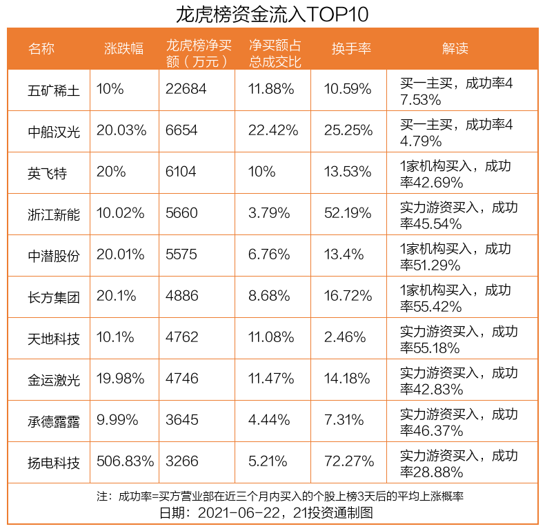 6月22日,上证指数上涨0.8%,深证成指上涨0.38%,创业板指上涨0.35%。盘后龙虎榜数据显示,共有41只个股因当日异动登上龙虎榜,资金净流入最多的是五矿稀土(000831.SZ),达2.27亿元。