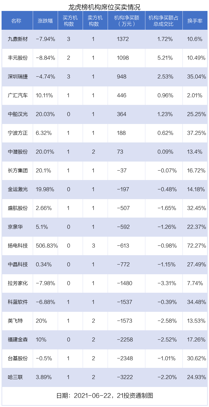 6月22日,19只个股龙虎榜出现了机构的身影,机构合计净卖出1.06亿元。具体来看,机构净买入7股,净卖出12股。