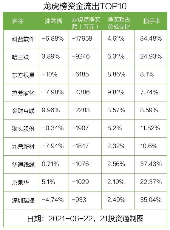 而龙虎榜中资金净流出最多的是科蓝软件(300663.SZ),被净卖出为1.8亿元,占总成交金额的4.61%。科蓝软件收盘下跌6.88%,换手率为34.48%。
