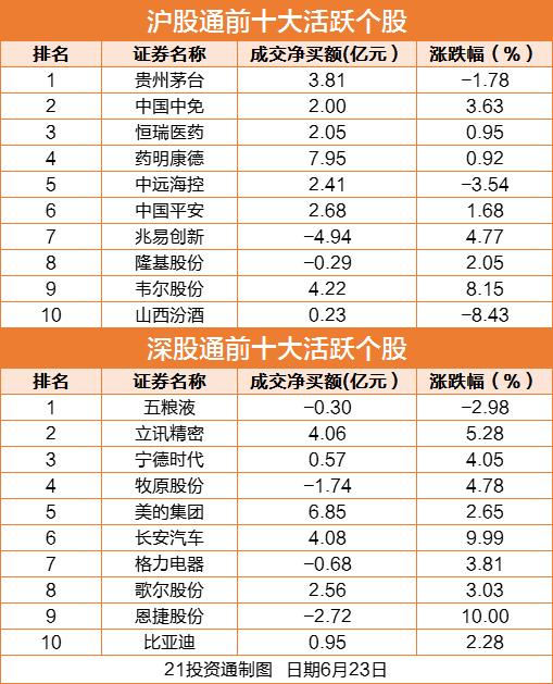 十大活跃个股方面,药明康德、美的集团、韦尔股份分别获净买入7.95亿元、6.85亿元、4.22亿元。兆易创新净卖出额居首,金额为4.94亿元。