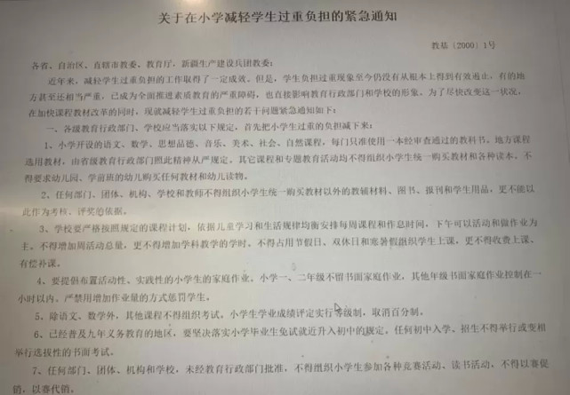 2000年1月3日,教育部下发《关于在小学减轻学生过重负担的紧急通知》,要求“学校要严格按照规定的课程计划,依据儿童学习和生活规律均衡安排每周课程和作息时间,下午可以活动和做作业为主。不得增加周活动总量,更不得增加学科教学的学时。不得占用节假日、双休日和寒暑假组织学生上课,更不得收费上课、有偿补课”。当年被称为“教育减负年”。