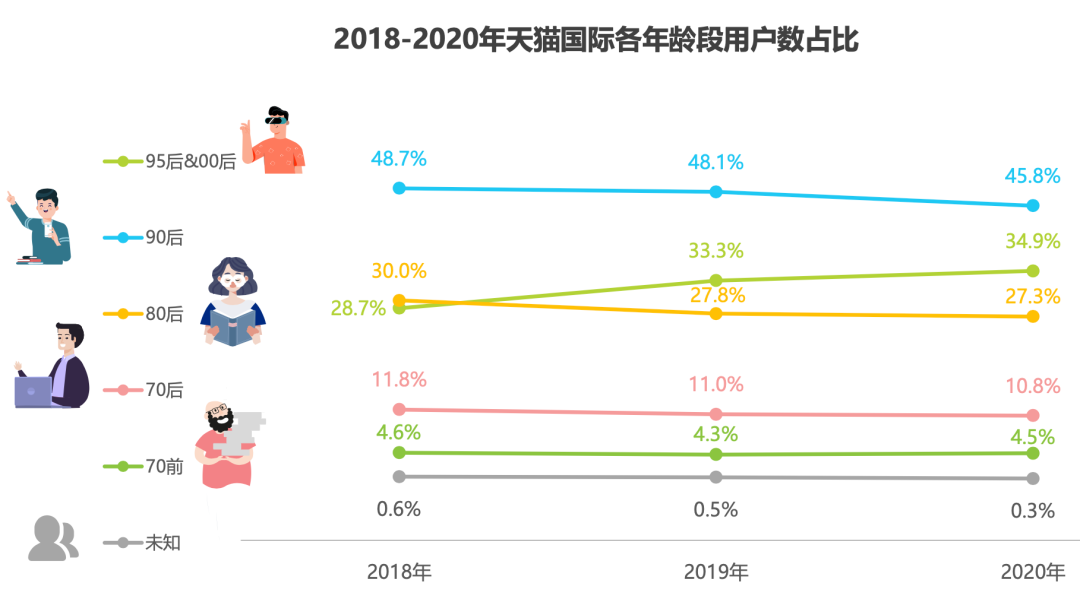 天猫国际数据显示,95后及00后的年轻群体占比从2018年的28.7%增长至2020年的34.9%,且进口商品消费占比显著高于其他代际,90后用户的占比也已经接近一半。