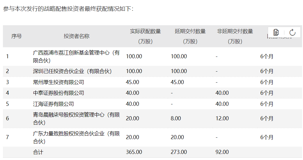 战略配售方面,7家战投共获配365万股,金额共计2920万元。