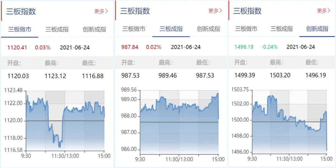 截至6月24日收盘,三板做市报1120.41点,上涨0.03%;三板成指报987.84点,上涨0.02%;三板创新报1496.19点,下跌0.24%。
