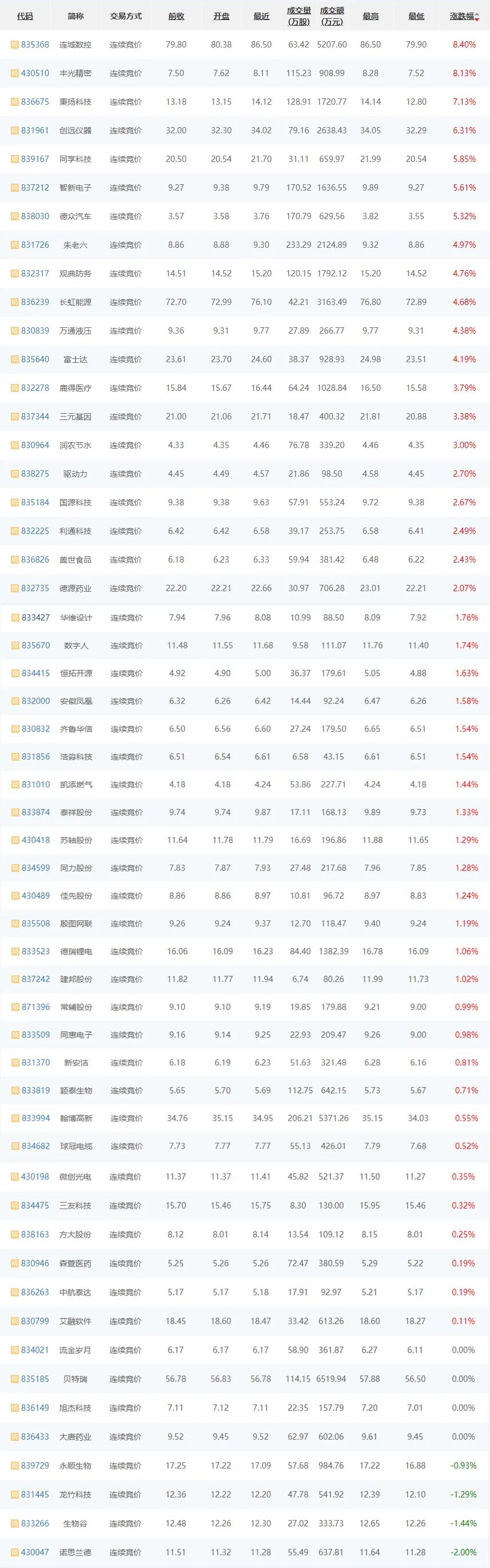6月24日,精选层普涨,46家企业上涨,4家平盘,4家下跌。其中,连城数控(835368)上市首日涨幅居首,上涨8.40%;其次,丰光精密(430510)上涨8.13%;诺思兰德(430047)跌幅居首,下跌2.00%;生物谷(833266)居次下跌1.44%;流金岁月(834021)、贝特瑞(835185)等平盘。