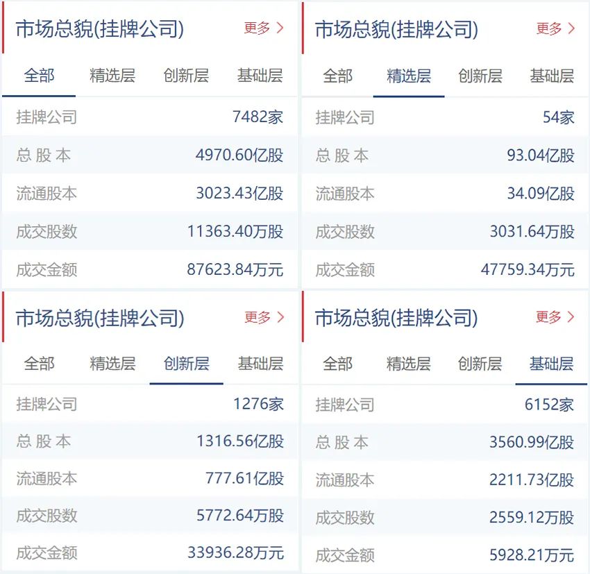 新三板挂牌公司总计7482家(精选层54家,创新层1276家,基础层6152家),总股本4970.60亿股,流通股本3023.43亿股。
