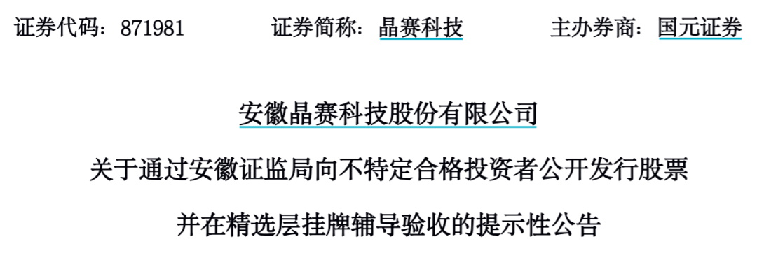 公告显示,安晶赛科技于 2021年2 月1日向安徽证监局报送了向不特定合格投资者公开发行股票并在精选层挂牌的辅导备案登记材料,并于2021年3月1日收到安徽证监局《关于确认安徽晶赛科技股份有限公司辅导备案的函》,安徽证监局接受公司的申请,予以辅导备案登记,辅导期自2021年2月26日开始,辅导机构为国元证券。
