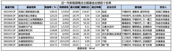 如果看近一年回报最高的基金,基本都是重仓了新能源的相关个股,比如近一年业绩排名前三的农银汇理新能源主题、华夏能源革新和前海开源公用事业。