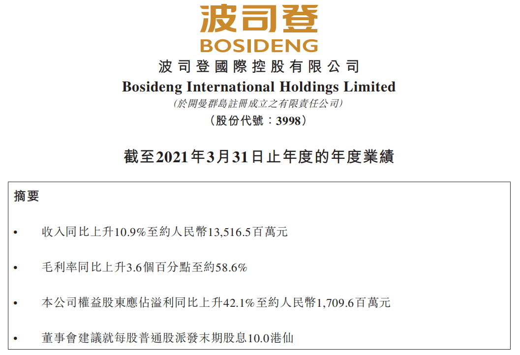 $波司登(03998.HK)$公布,截至2021年3月31日止年度,公司收入同比上升10.9%至约人民币135.2亿元,毛利率同比上升3.6个百分点至58.6%,公司权益股东应占溢利同比上升42.1%至约人民币17.1亿元,董事会建议就每股普通股派发末期股息10.0港仙。