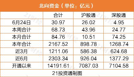 据21投资通(微信号ID:touzit21)智能监测,北向资金今日净买入30.97亿元,其中沪股通净买入26.02亿元,深股通净买入4.95亿元。