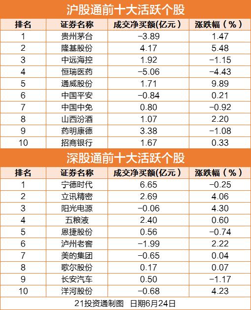 十大活跃个股方面,宁德时代、隆基股份、药明康德分别获净买入6.65亿元、4.17亿元、3.38亿元。恒瑞医药净卖出额居首,金额为5.06亿元。