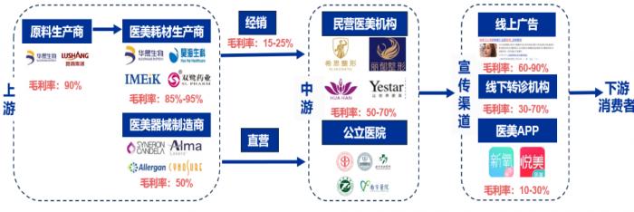 但监管体系趋严才是大势。近期,八部门发文,将于6月到12月联合开展打击非法医疗美容服务专项整治工作,严格规范医疗美容服务相关药品和医疗器械生产。同时,卫健委、CFDA把控着上游医疗耗材及器械的合规性。“监管趋严,有助于正规品牌厂家发展。”王立平指出,“从国内医美产业链来看,上游药械端集中度较高,研发与注册拿证壁垒较高,盈利能力最强。中游医美服务端集中度较低,各连锁医美机构仍在跑马圈地,未来有望形成全国性龙头。”