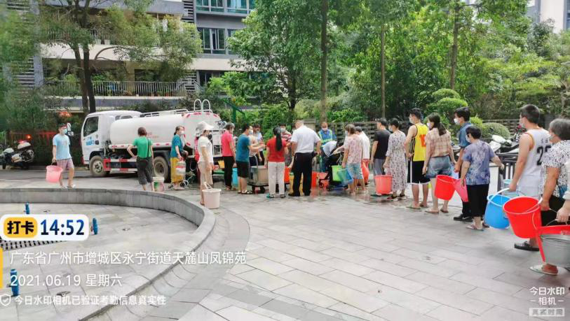 近日,增城区碧桂园凤凰城小区主供水管故障导致小区断水,小区内10万居民的正常用水受到影响。小区所在永宁街道紧急联系负责当地保洁、清运服务的广州环投,广州环投积极响应街道需求,迅速组建应急运水车队支援凤凰城小区,保障供水设施检修期间小区10万居民的正常生活用水。