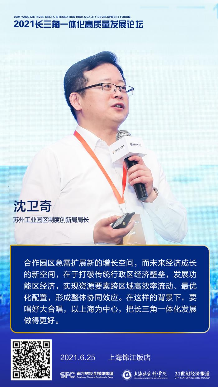 6月25日上午,苏州工业园区制度创新局局长沈卫奇在“2021长三角一体化高质量发展论坛”上发表了题为《以合作园区建设助推区域一体化》的演讲。