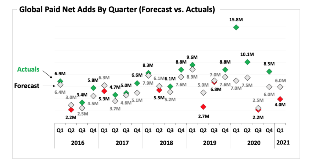 当然,奈飞并不是高枕无忧,6月22日它签约了斯皮尔伯格的工作室,试图进一步巩固内容的护城河,抵抗来自迪士尼、HBO等流媒体对手的竞争。一季度,奈飞新增付费订阅用户398万人,相比去年同期的1577万人暴跌约74.8%,大幅低于市场预期的629万人和自身预期的600万,这导致其盘后股价跌超11%。