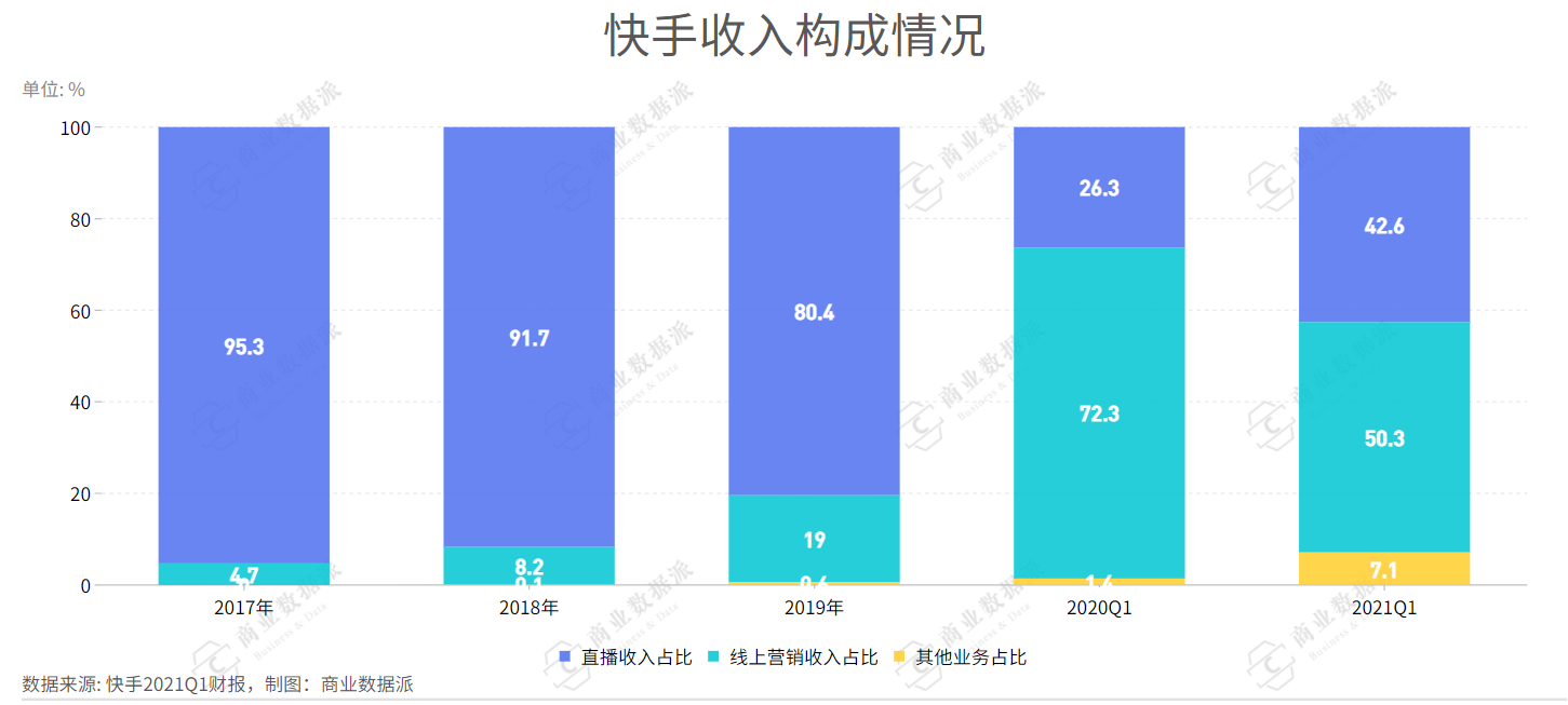 逐渐去家族化的快手,出现一丝营收调整的转机。从快手的营收结构上看,直播、线上营销服务以及其他业务是其三大收入来源,此前直播业务贡献收入最多,2020年该业务占总收入比重为72.3%,2021年Q1该比重下降为42.6%,线上营销的收入比例首次超过50.3%。国内商业化转变的试水成功,或许为其海外业务的变现提供一个可参考的逻辑。